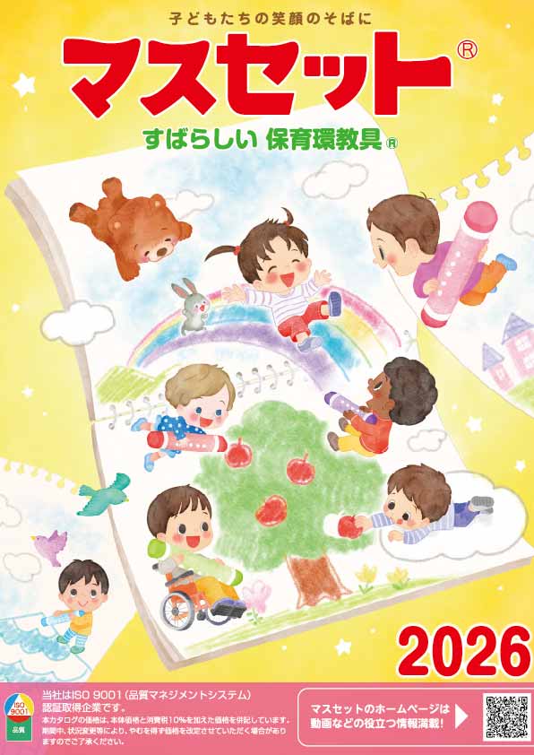 2026年度版マスセット総合カタログが発刊となりました。最近の世界情勢による諸物価の高騰や円安の進行など、経済は先行き不透明な状況でございます。そのような中でも私たちマスセットは、明るい未来のため、“子どもたちの笑顔のそばに”の下、“安全性”、“創造性”を第一に“環境”に配慮しながら、思い出に残る保育備品を提供し続けていきます。