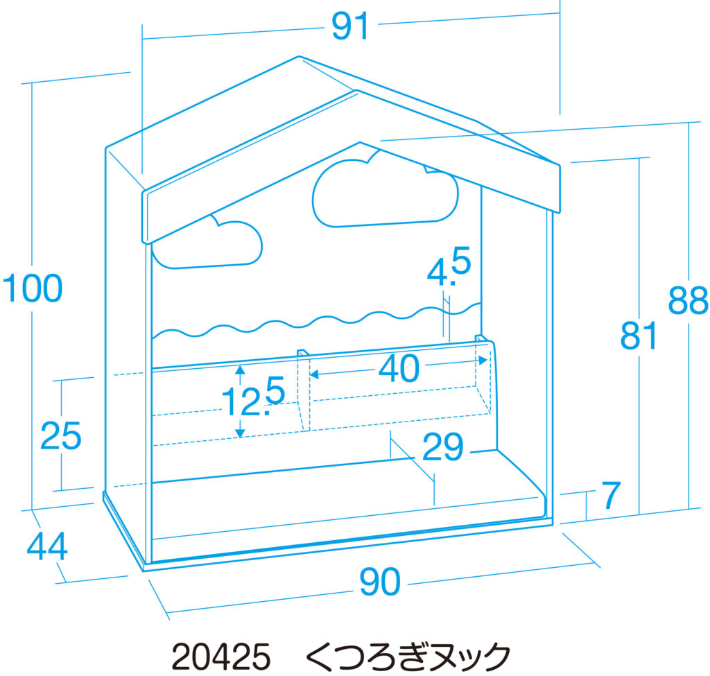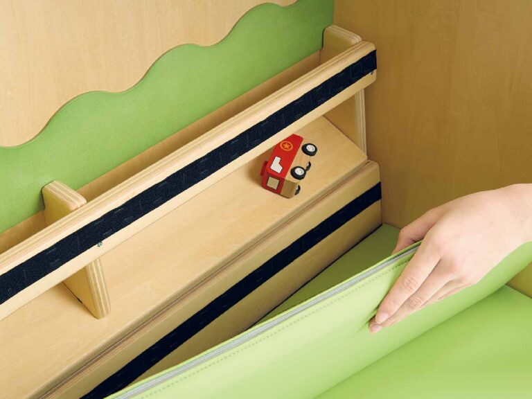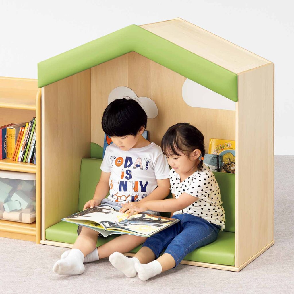 扉などで完全に空間を区切るのではなく、 前面をオープンにすることで周りの気配を感じながらも リラックスすることができます。 緑の屋根板には、裏側にもクッションが付いています。