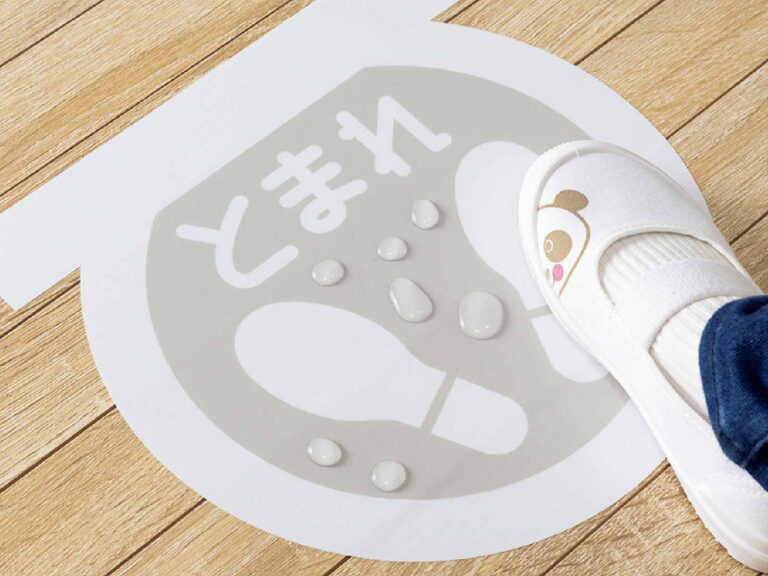 道路表示や標識と同じデザインのシールを壁面と床面に貼ることで、園内の通行の注意を促します。 また、お外でのお散歩の際も同じマークを見ることになるので交通安全の意識も高まります。 ※屋外や、路面での使用はできません。